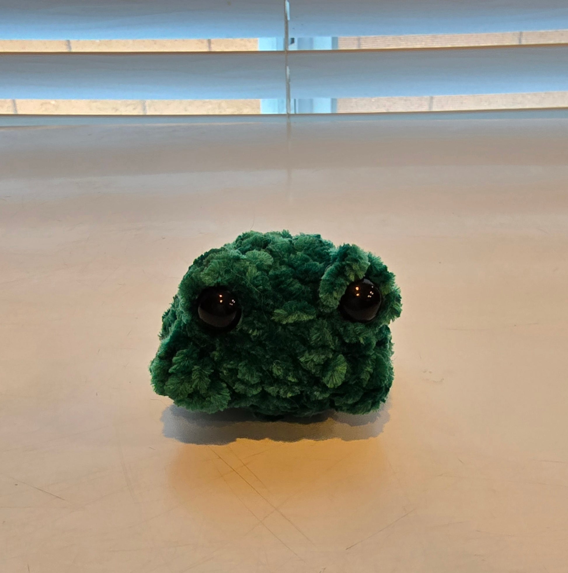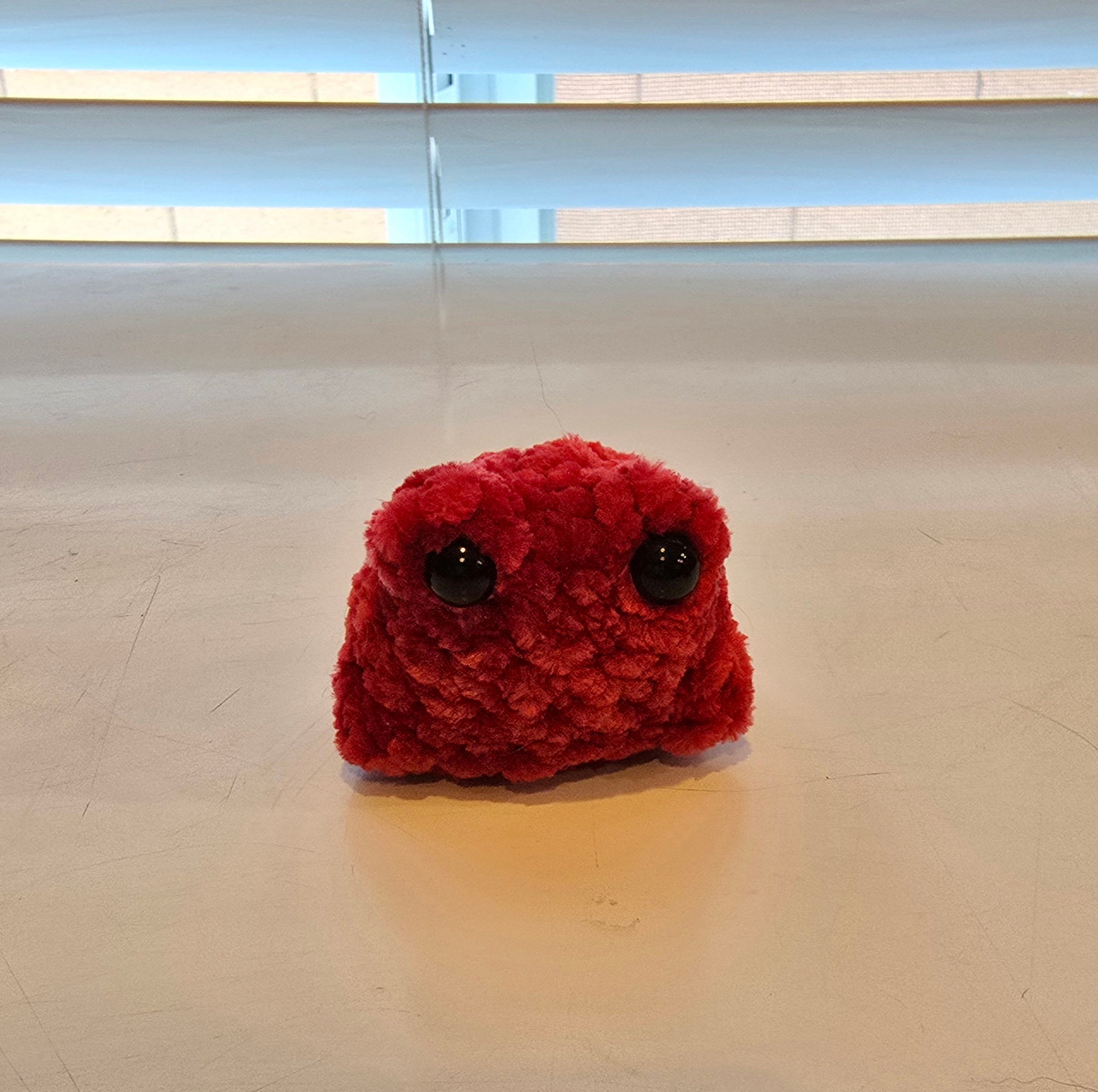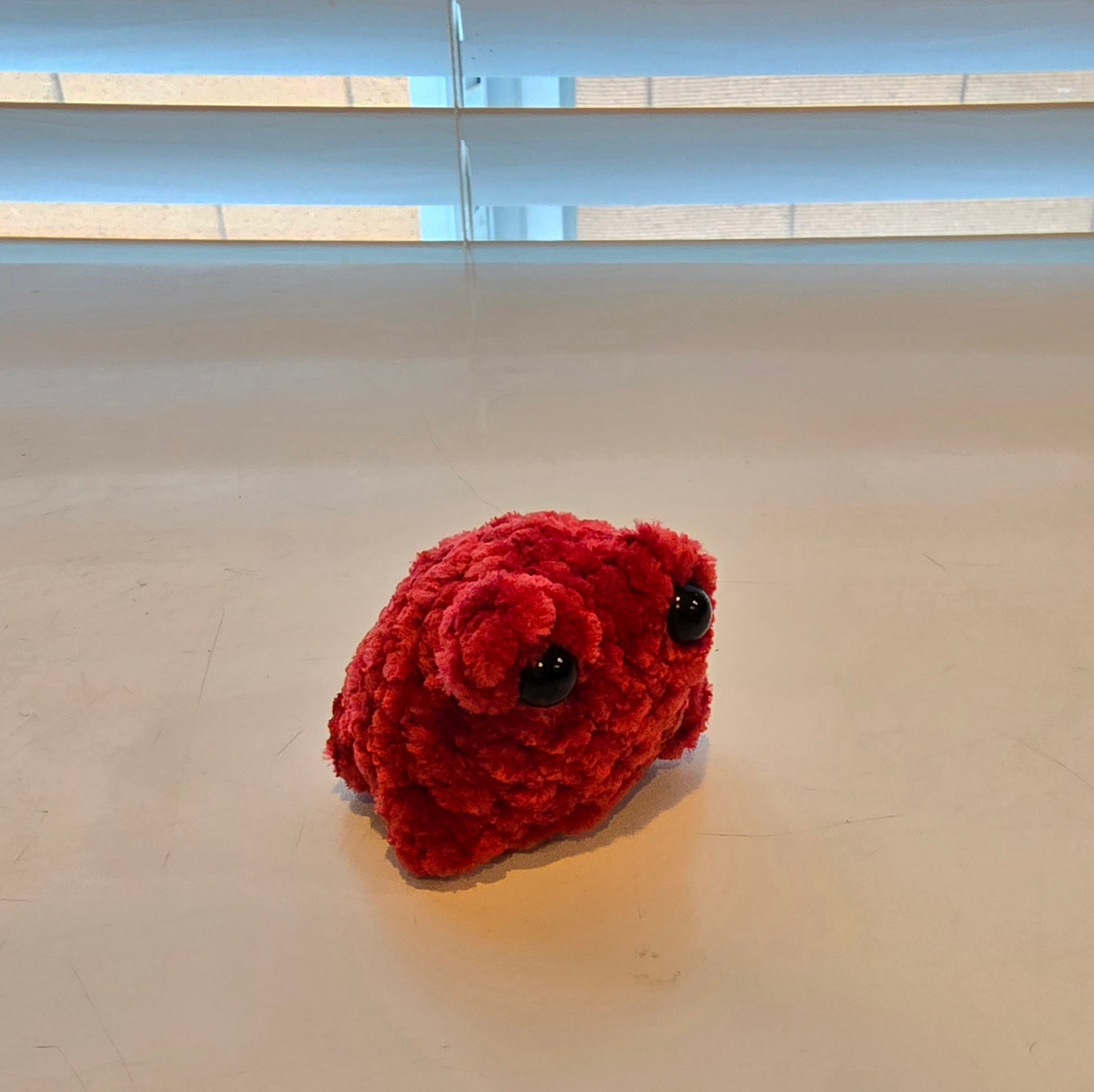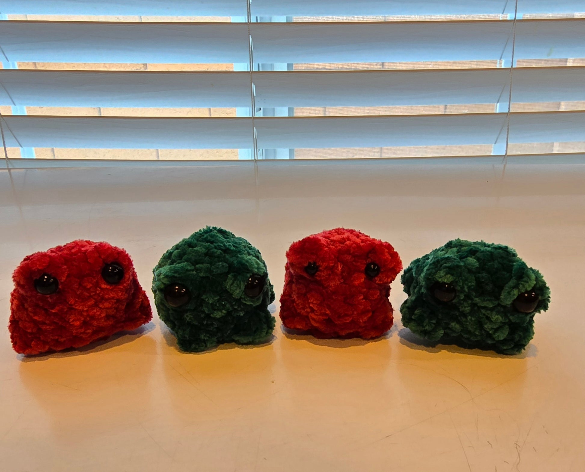 A lil pocket sized frog plush in green or red. Plushie measures approximately 2.5 inches tall, 3 inches wide, and 6 inches in diameter. Made of chenille yarn, polyester stuffing, and plastic safety eyes. Pattern by @naomi._.crochet